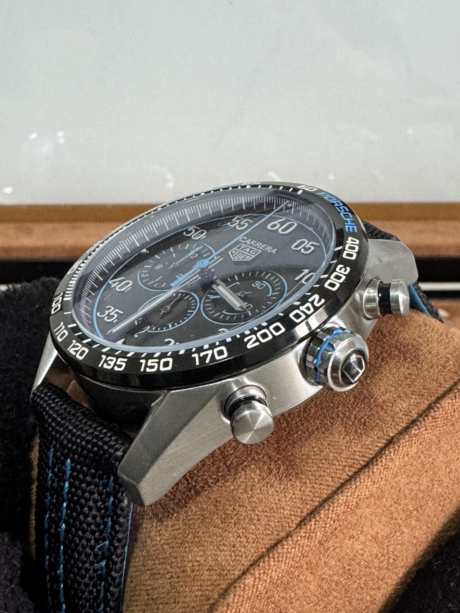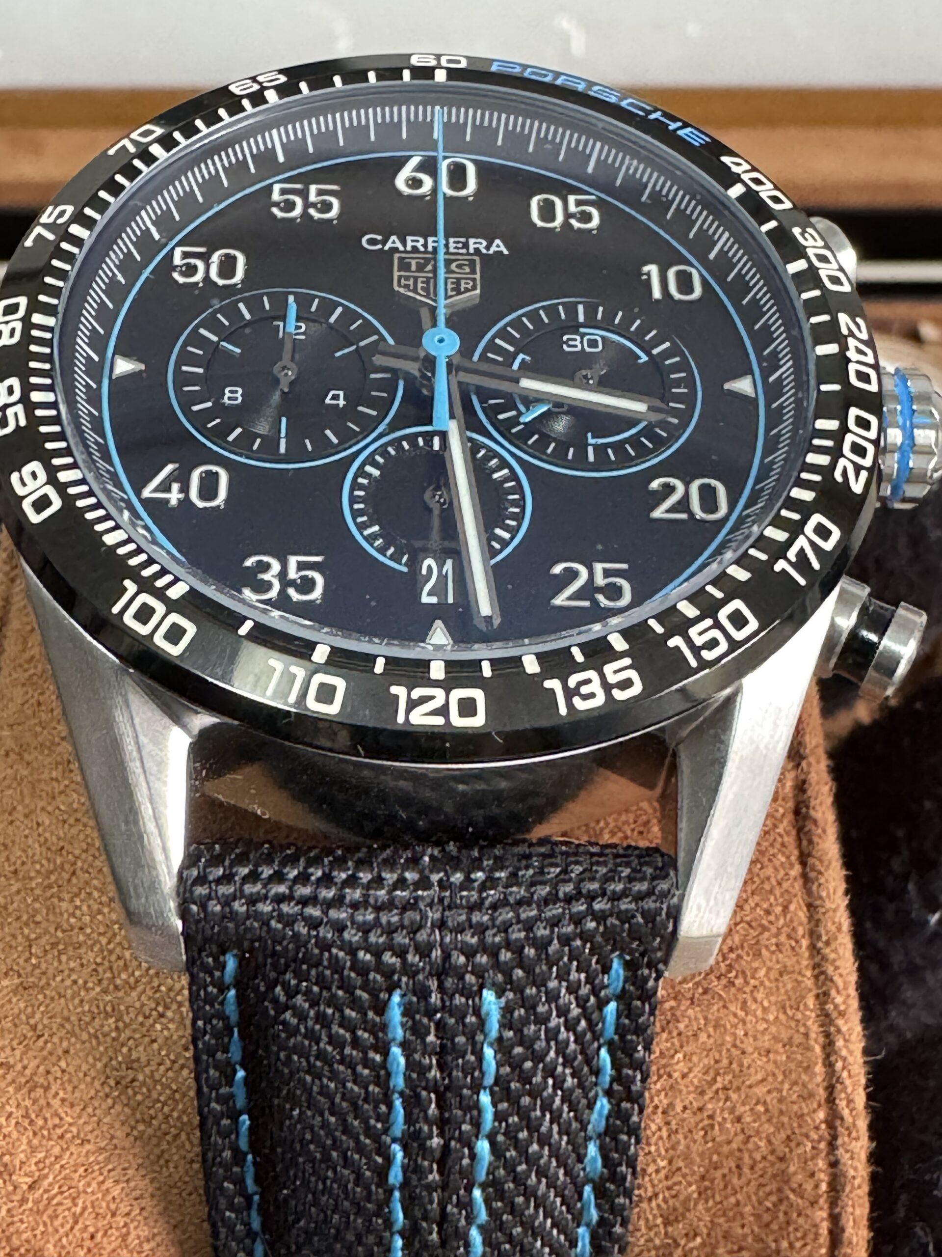 O Relógio Carrera 44mm Quartzo Vidro Safira conta com movimento quartz com máquina Ronda G20, pulseira de nylon, vidro de cristal safira resistente a arranhões.