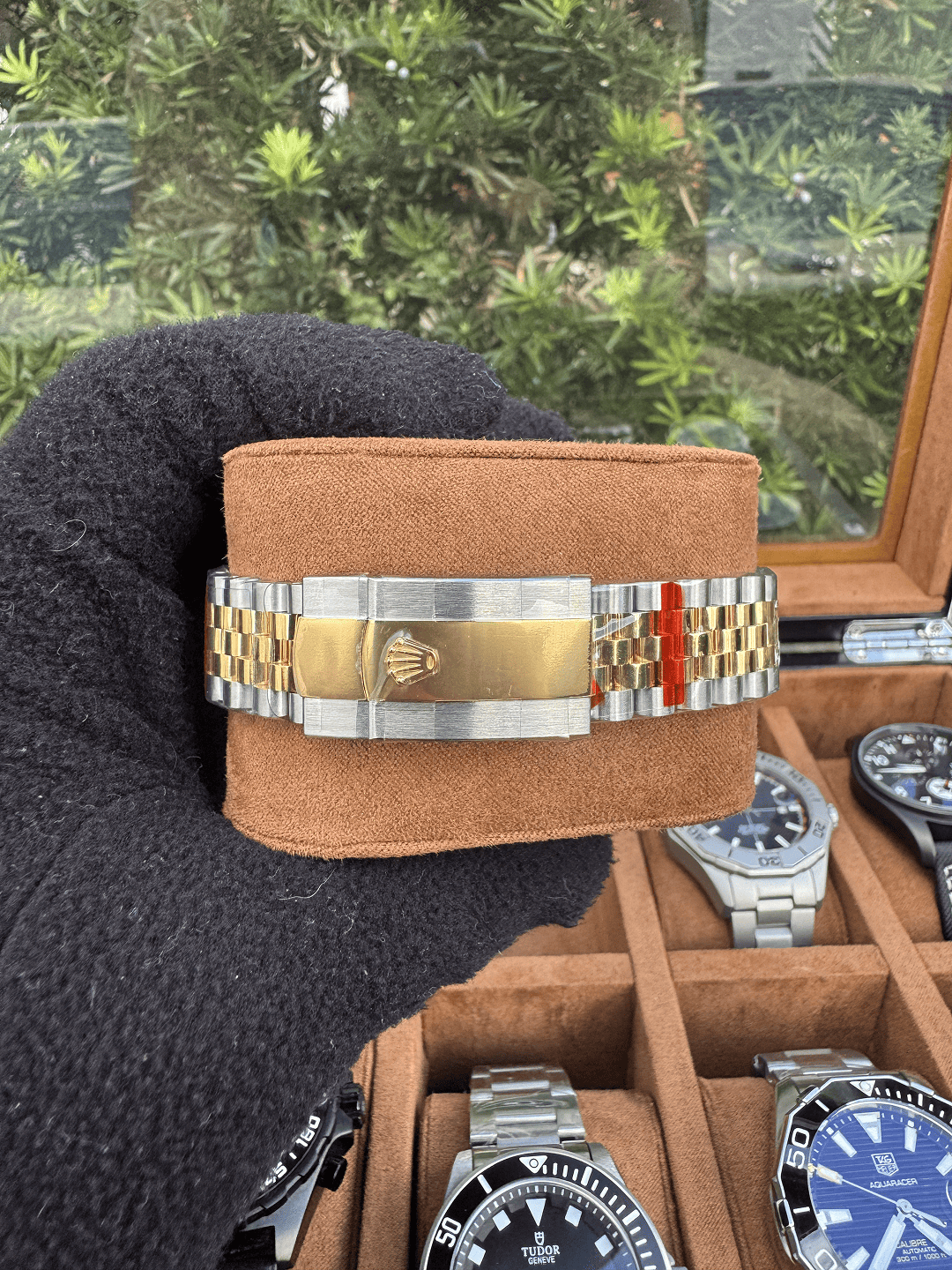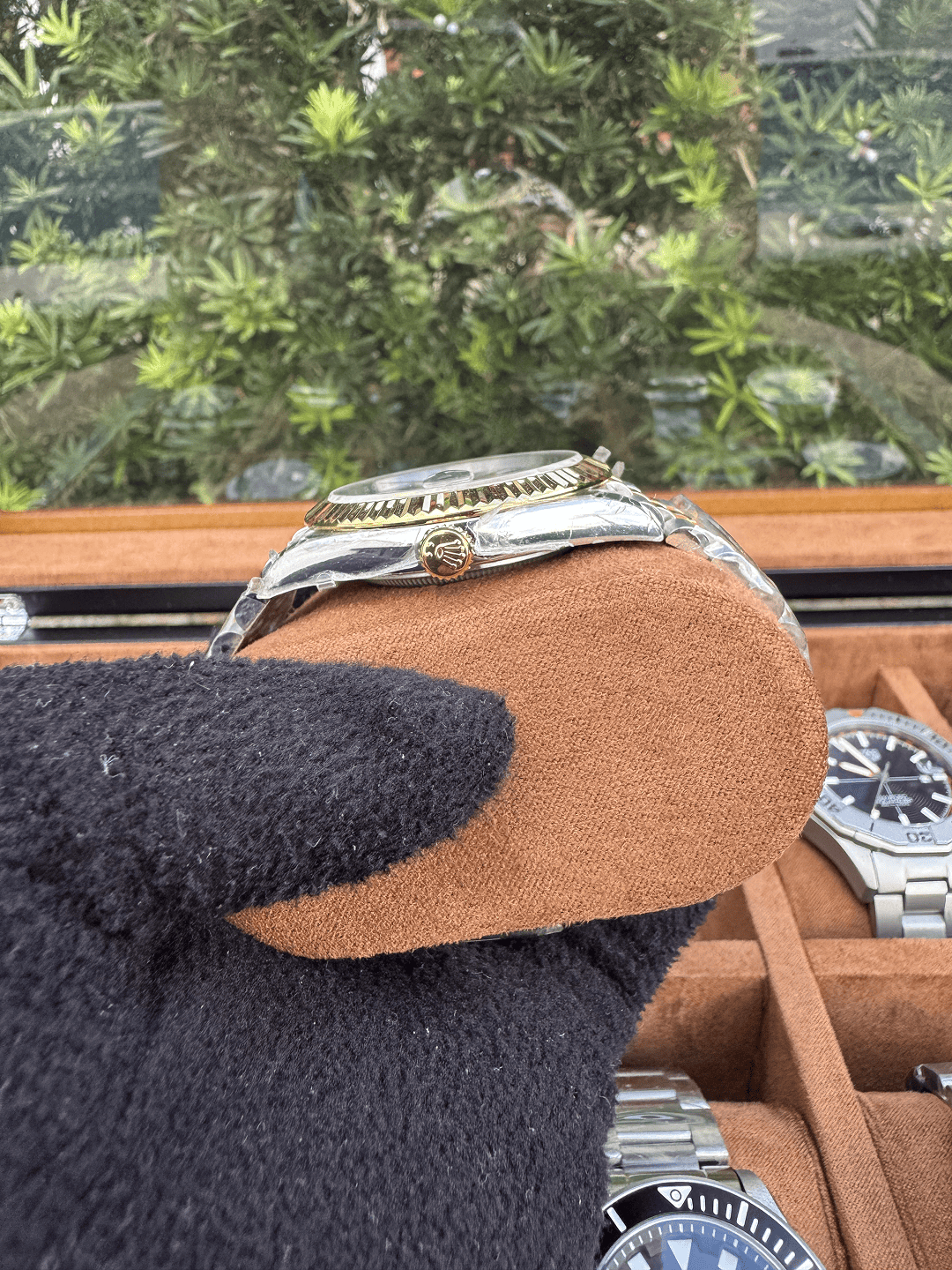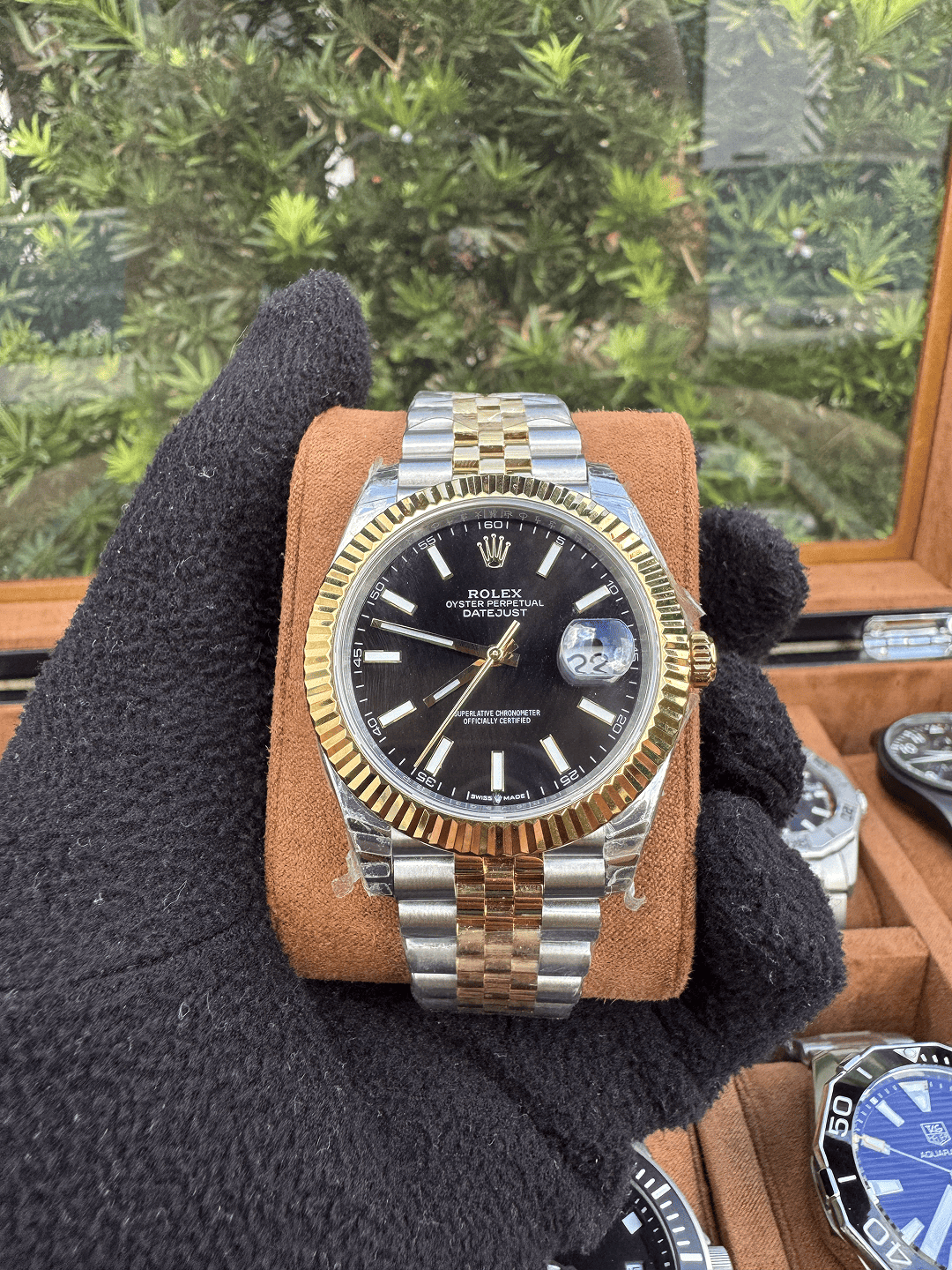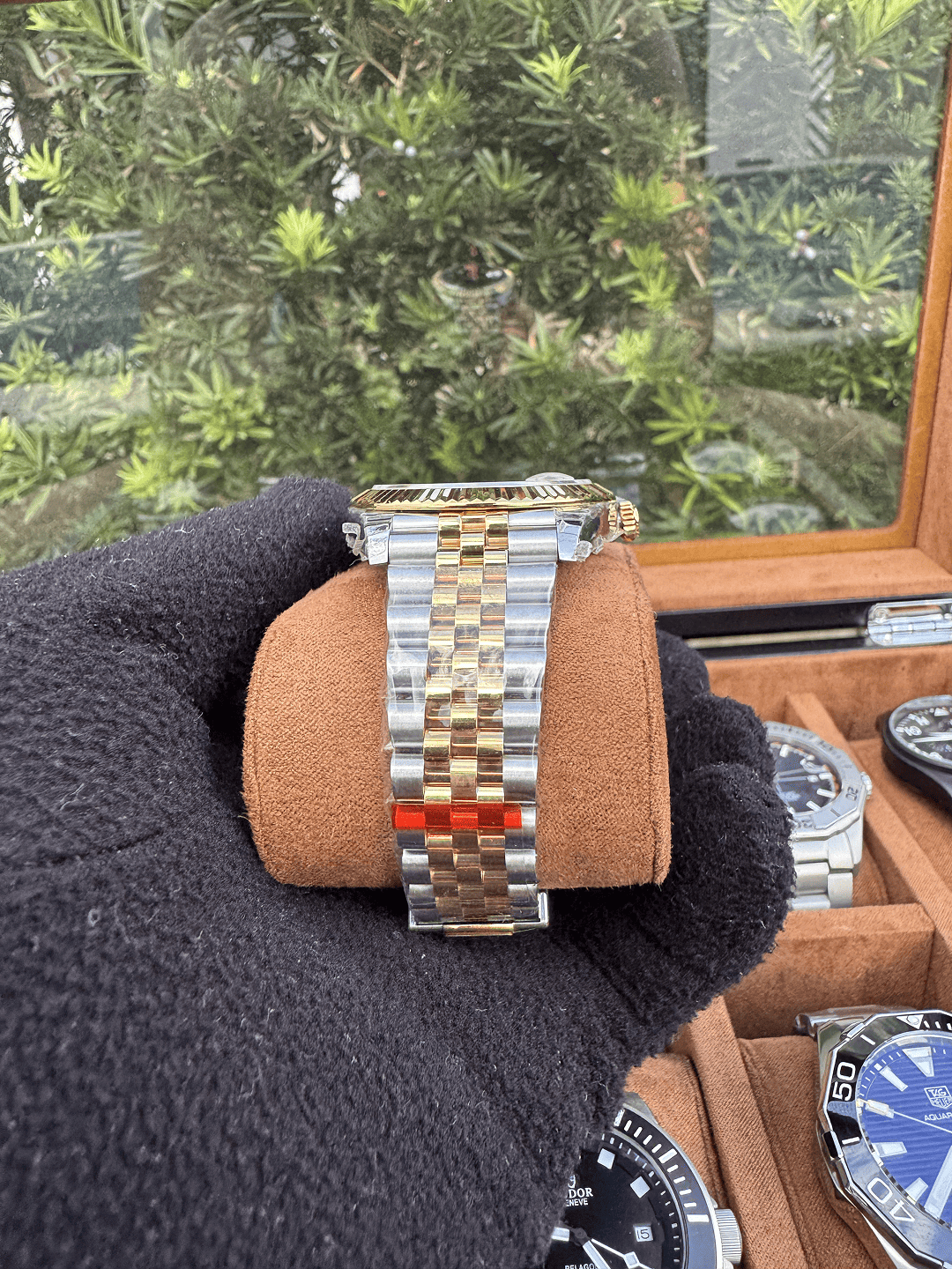 Com estrutura em aço inoxidável combinada ao banho de ouro 18K, este modelo entrega brilho superior, presença marcante e acabamento premium. O bezel em ouro 18K reforça o luxo da peça, tornando-a extremamente desejada para clientes que procuram exclusividade.