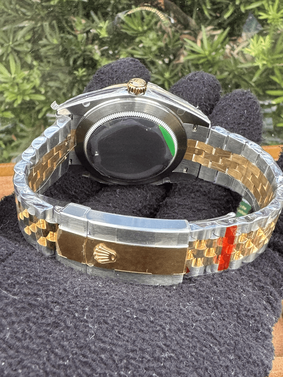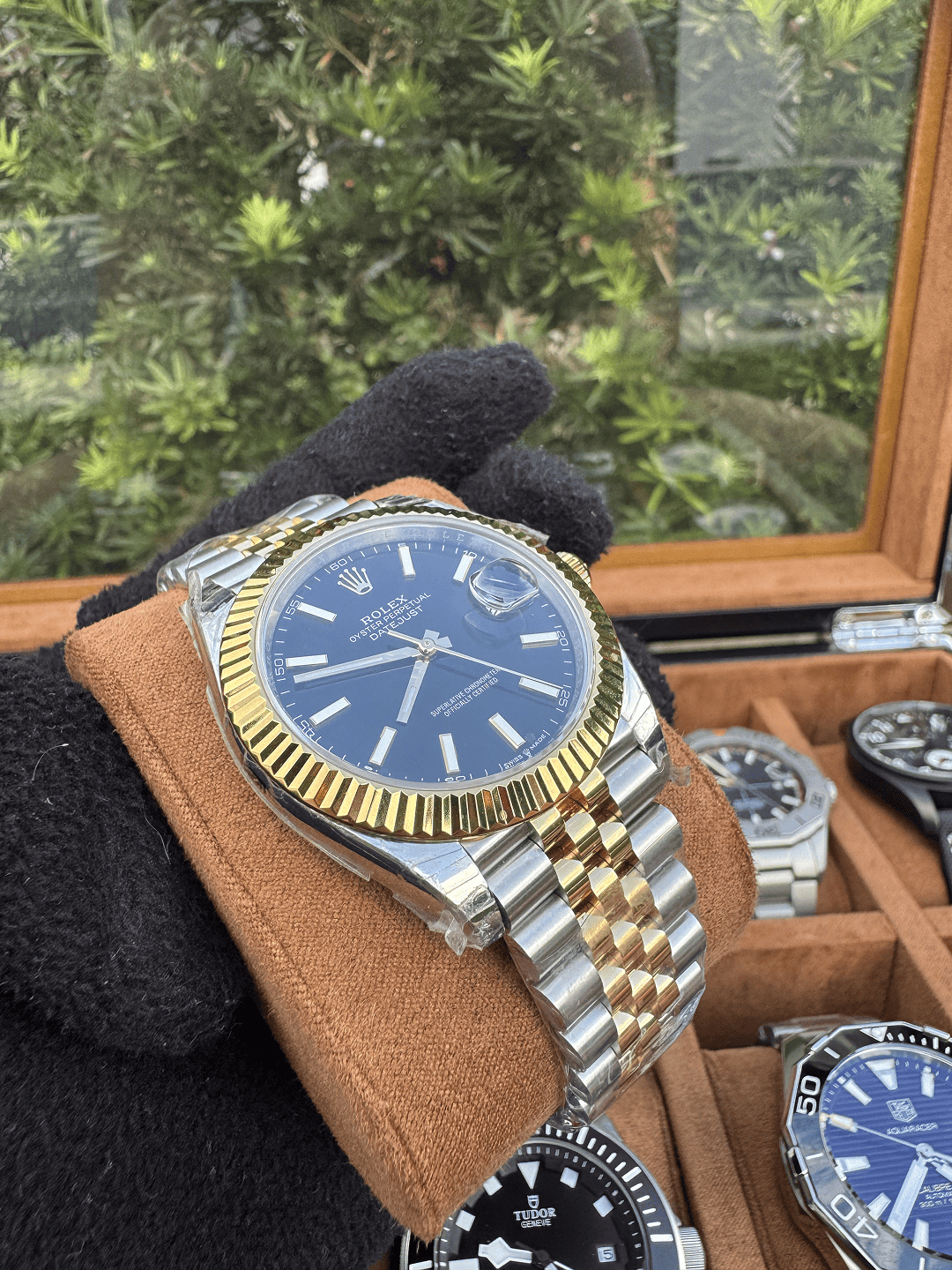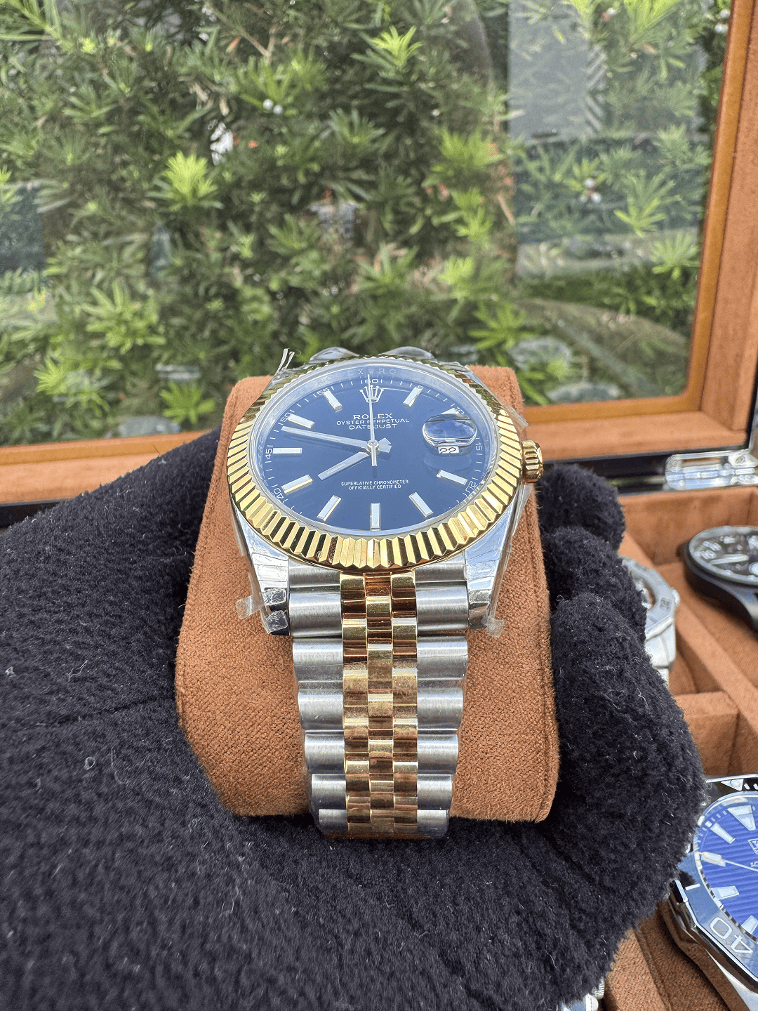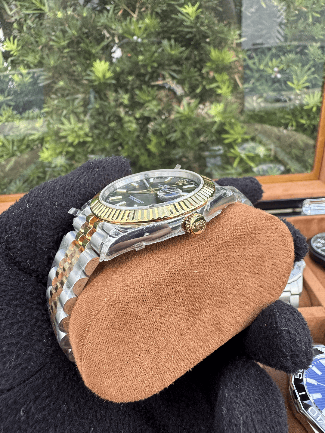 Com estrutura em aço inoxidável combinada ao banho de ouro 18K, este modelo entrega brilho superior, presença marcante e acabamento premium. O bezel em ouro 18K reforça o luxo da peça, tornando-a extremamente desejada para clientes que procuram exclusividade.