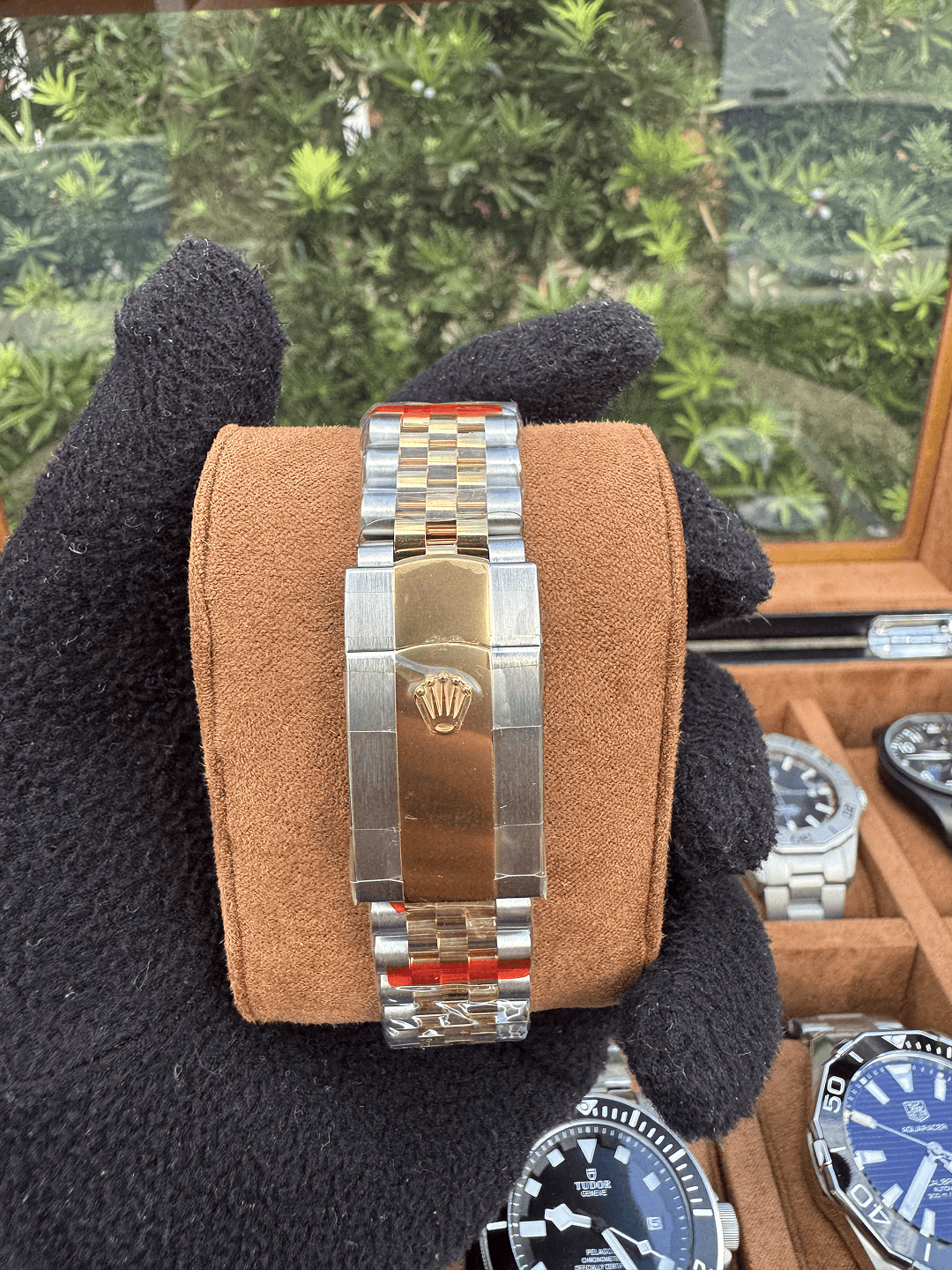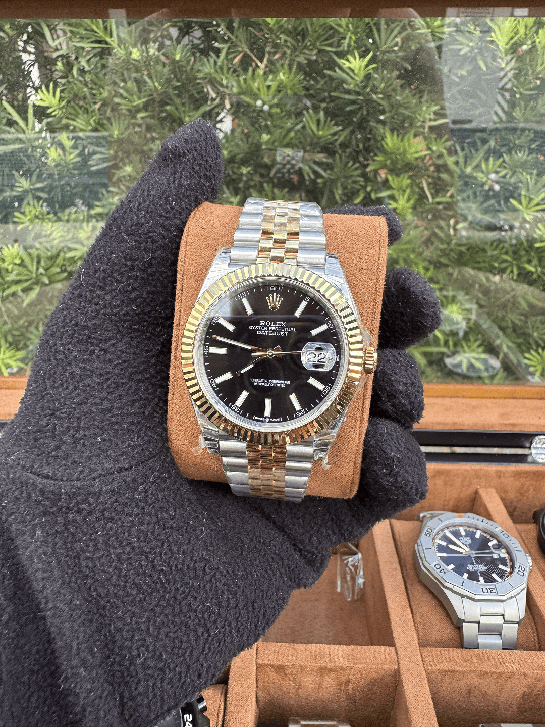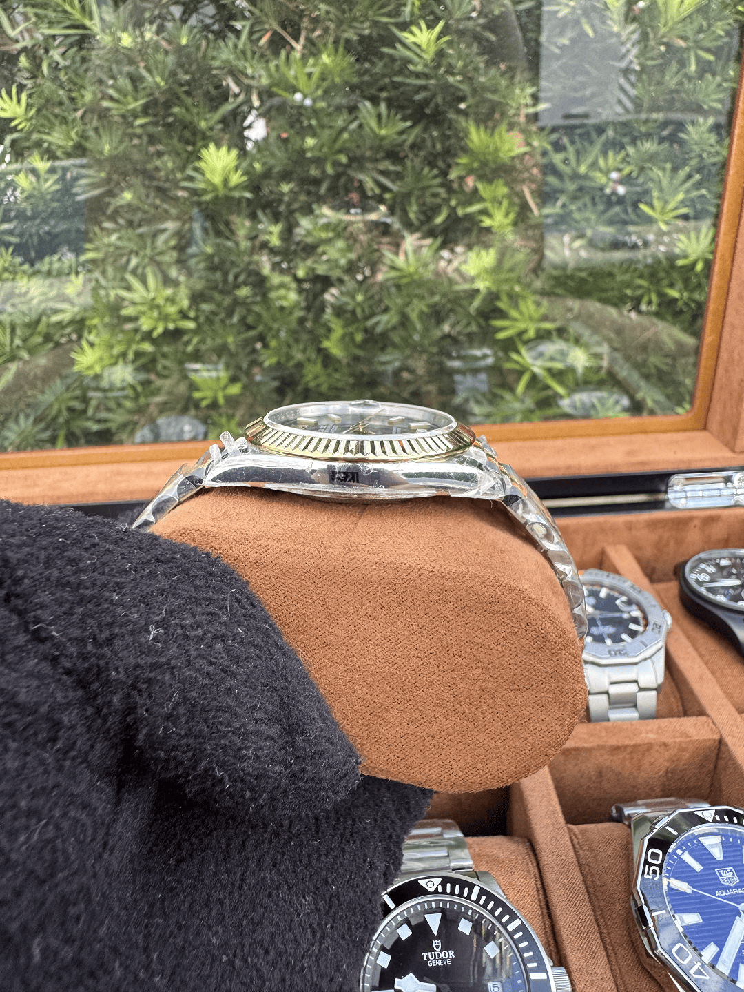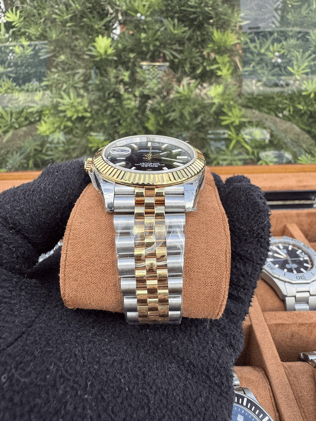 Com estrutura em aço inoxidável combinada ao banho de ouro 18K, este modelo entrega brilho superior, presença marcante e acabamento premium. O bezel em ouro 18K reforça o luxo da peça, tornando-a extremamente desejada para clientes que procuram exclusividade.