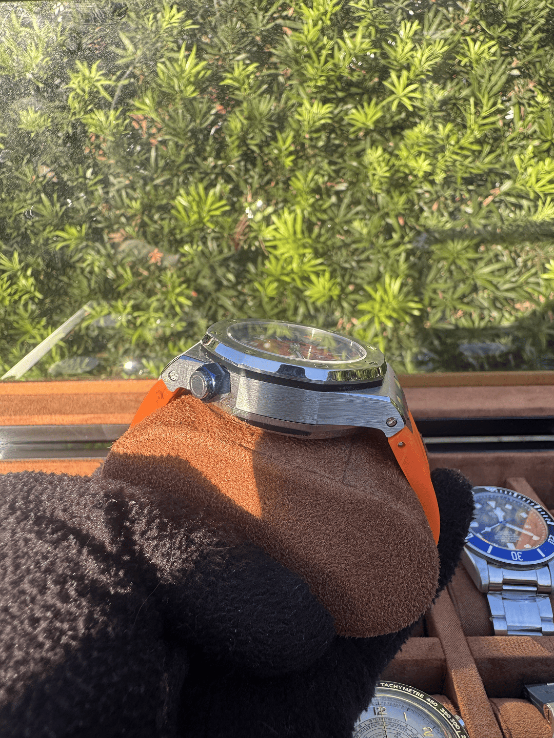 O movimento automático com máquina BASE ETA 2840 proporciona precisão e confiabilidade, enquanto o bezel em cerâmica e o vidro de cristal safira garantem durabilidade e proteção contra riscos. O modelo conta com datador e ponteiro de segundos totalmente funcionais, reforçando seu apelo esportivo e profissional.
